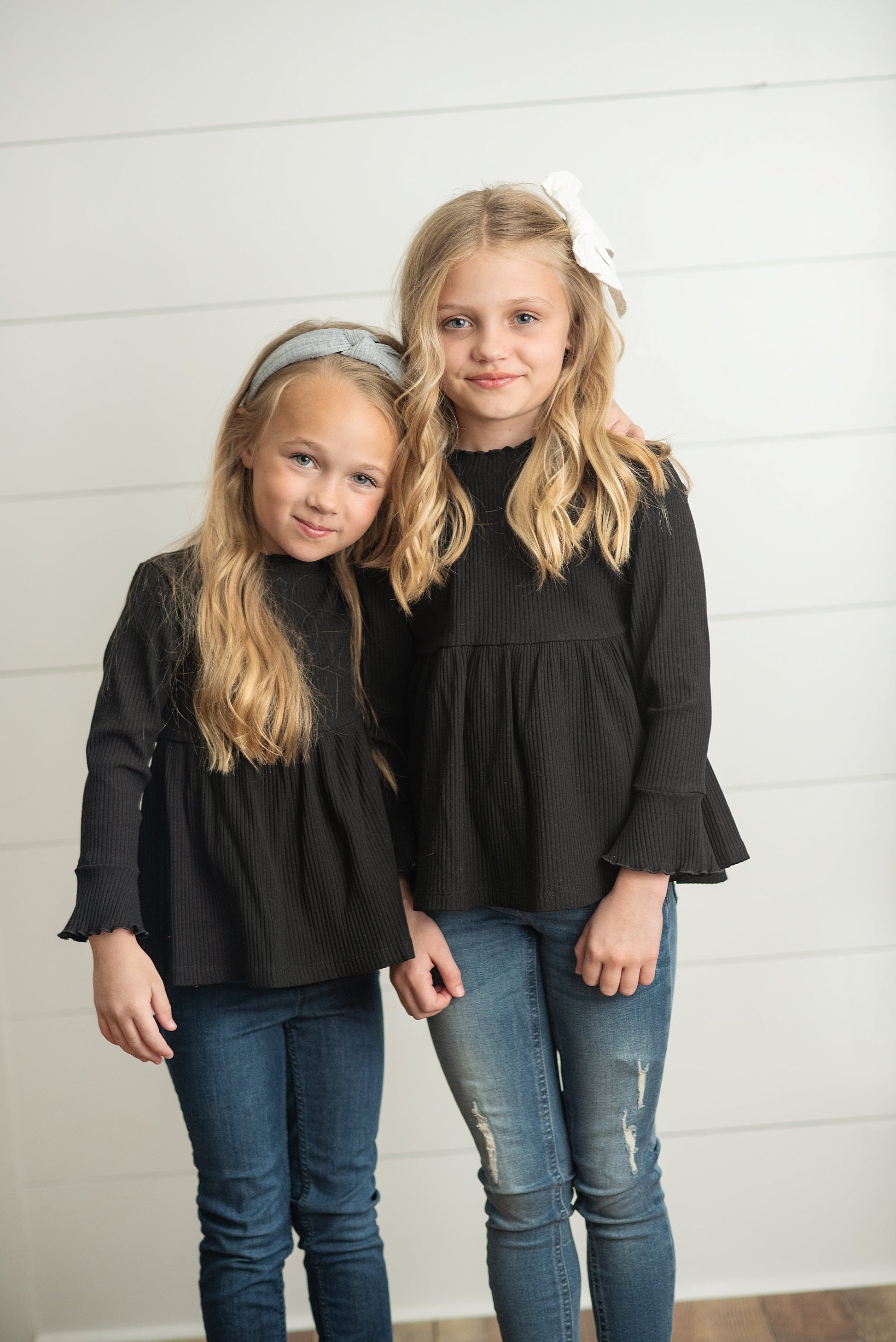 This black ribbed long sleeve shirt adds a fun twist to your classic wardrobe with its fluttery sleeves and delicate lettuce trim on the cuffs and collar. Perfect for layering or wearing solo, it’s a playful staple that brings a touch of charm to any outfit.