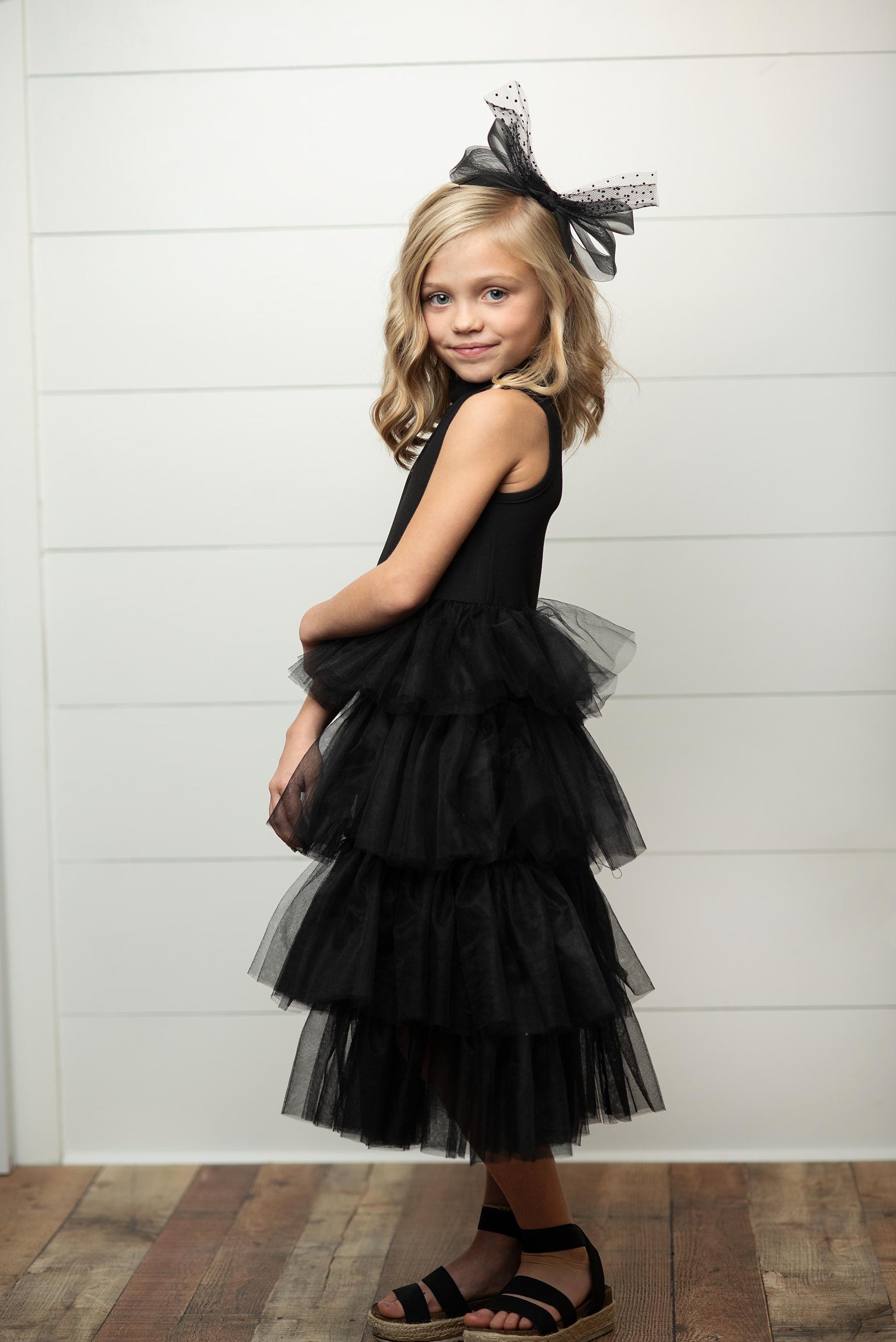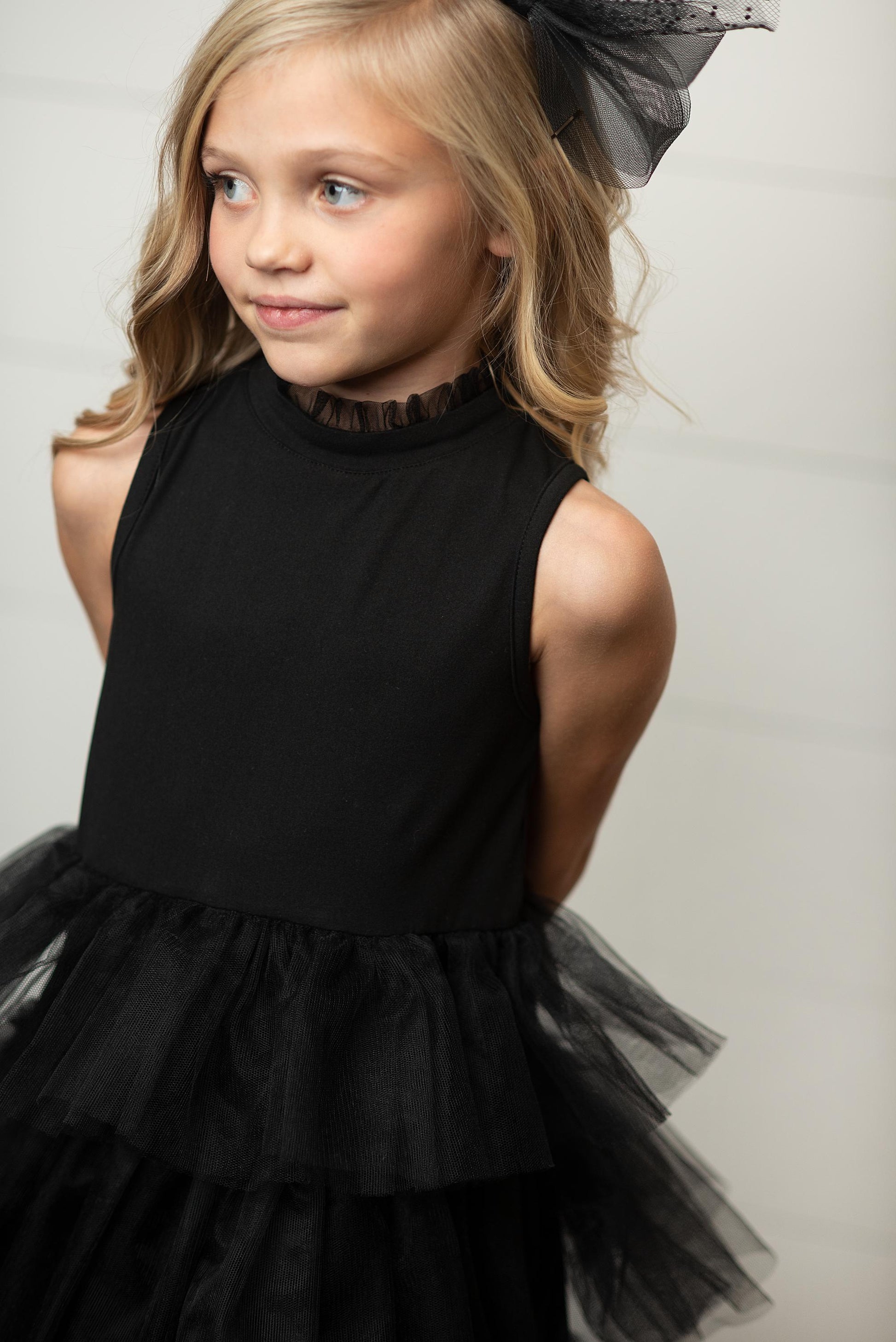 Be the belle of the ball in this black tiered tulle dress. Perfect for spring and summer parties, its high ruffle collar adds a touch of fancy. Sleeveless and stylish, this dress will have heads turning.