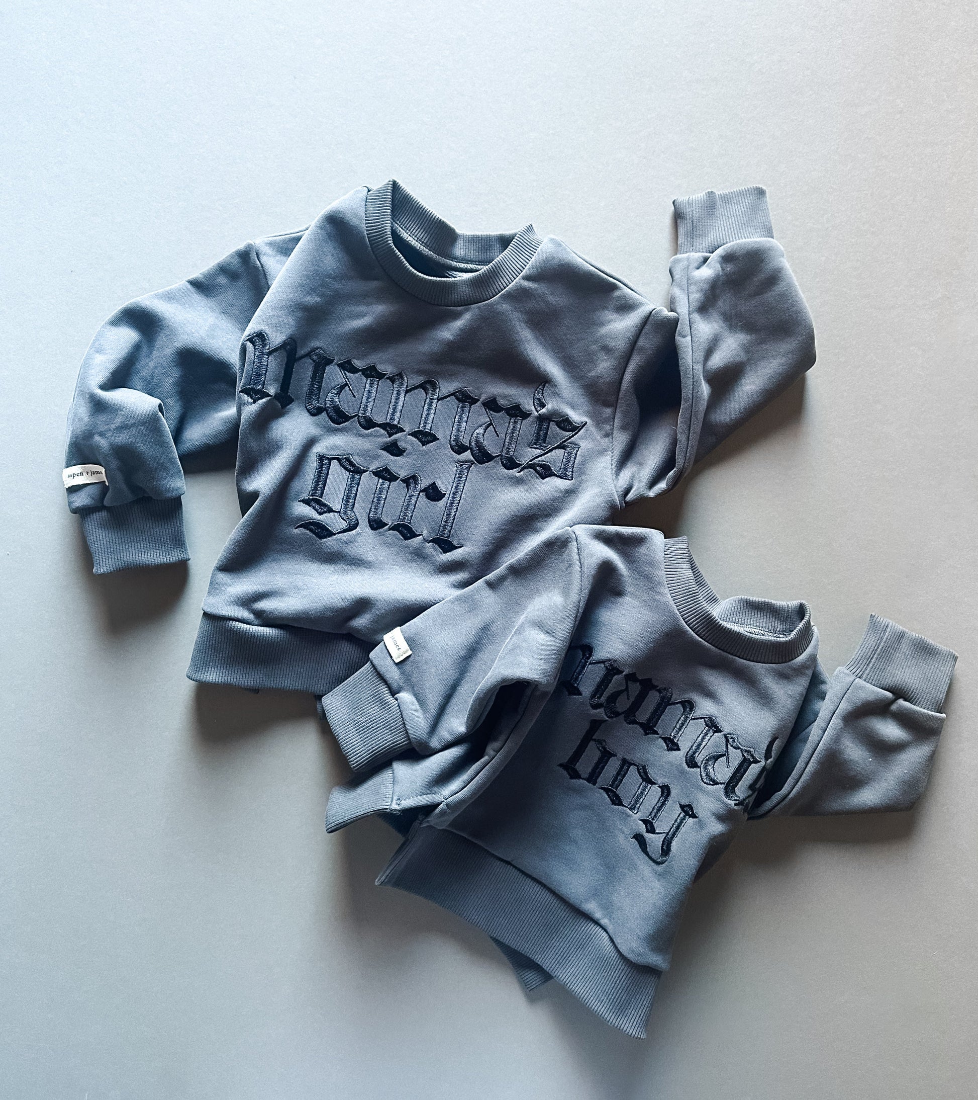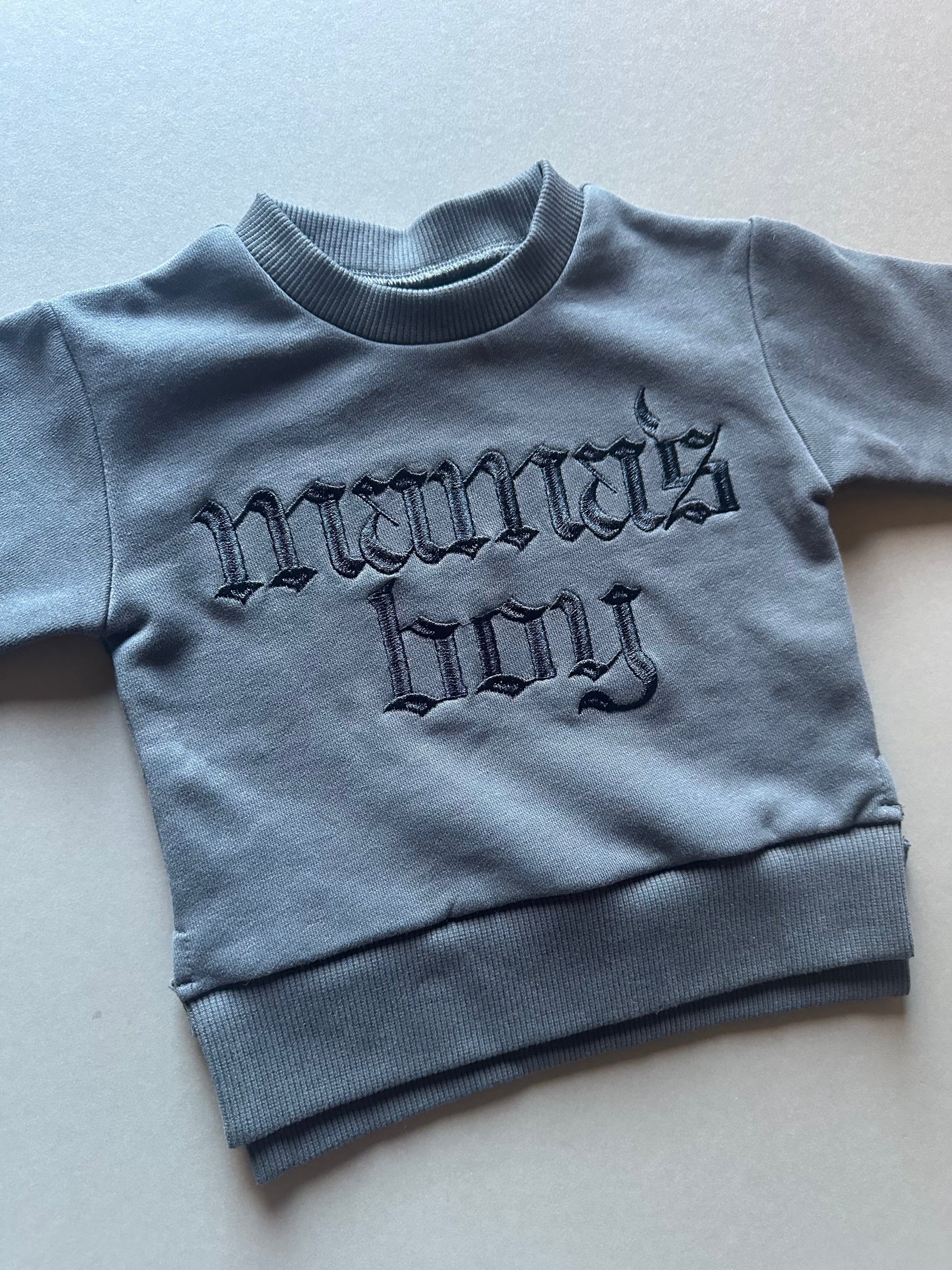 We are here to design the coolest styles that also compliment mom’s classic style, and this crewneck is HITTING THE MARK! Your little man will be the best-dressed kid in the room, boasting his very favorite title: Mama’s Boy in dramatic, luxurious embroidery. The monochromatic colorway combines dark charcoal 100% cotton and pitch black stitching. The best part? He can match Mama and sis for the coolest family style.