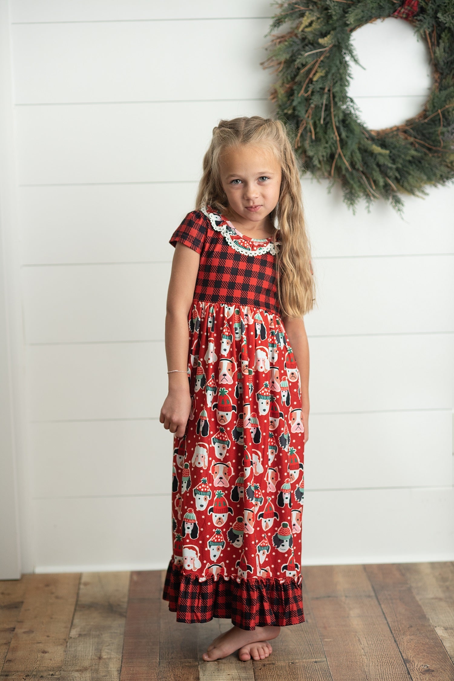 This Christmas, give your little girl the gift of cozy comfort with our Puppy Dog Lounge Play Gown. Perfect for lounging around in during the holiday season, this gown features an adorable puppy design that is sure to bring joy to your child's day. Made with soft and breathable fabric, it provides warmth and relaxation that every child deserves. Make this holiday season a special one with our Christmas Puppy Dog Lounge Play Gown.