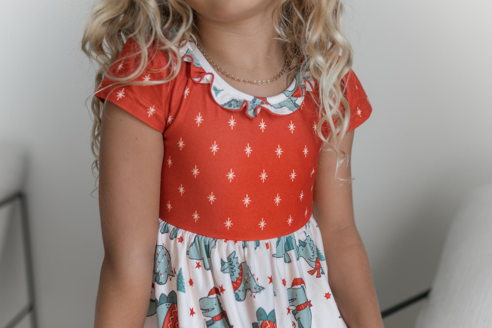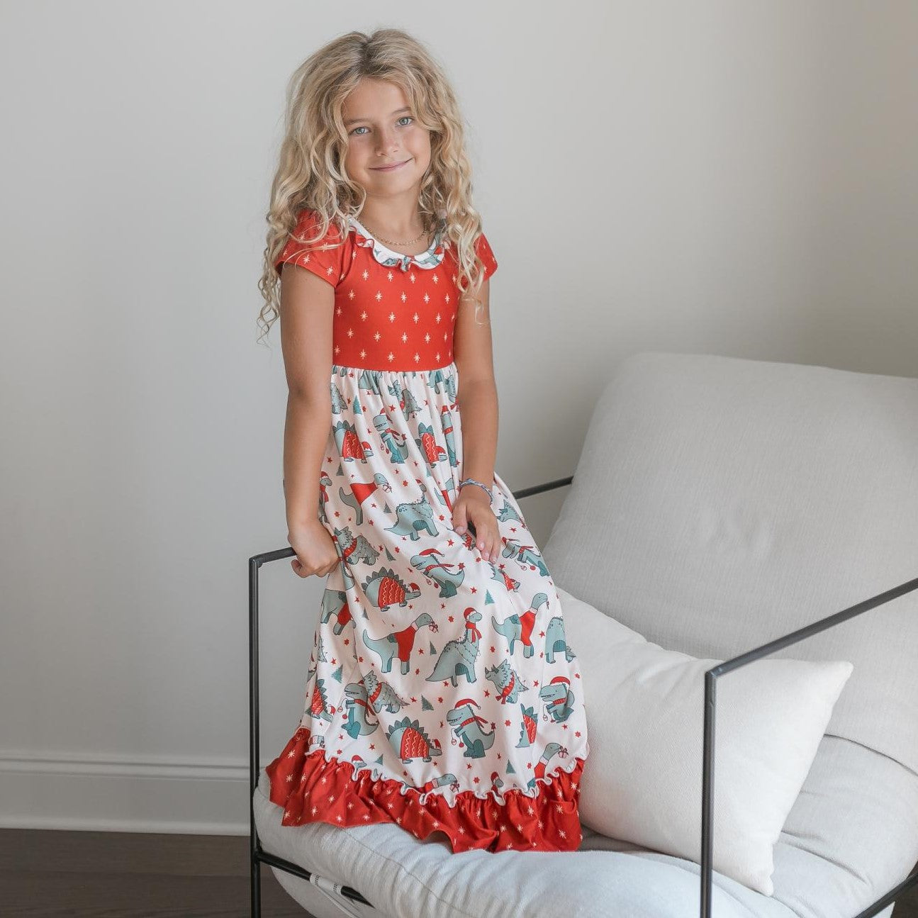 Introducing our festive Dino Lounge Gown for girls! Made with super soft fabric, this holiday-inspired gown features a cute dinosaur print and is perfect for cozy nights by the fire. Give the gift of comfort and style this Christmas season.