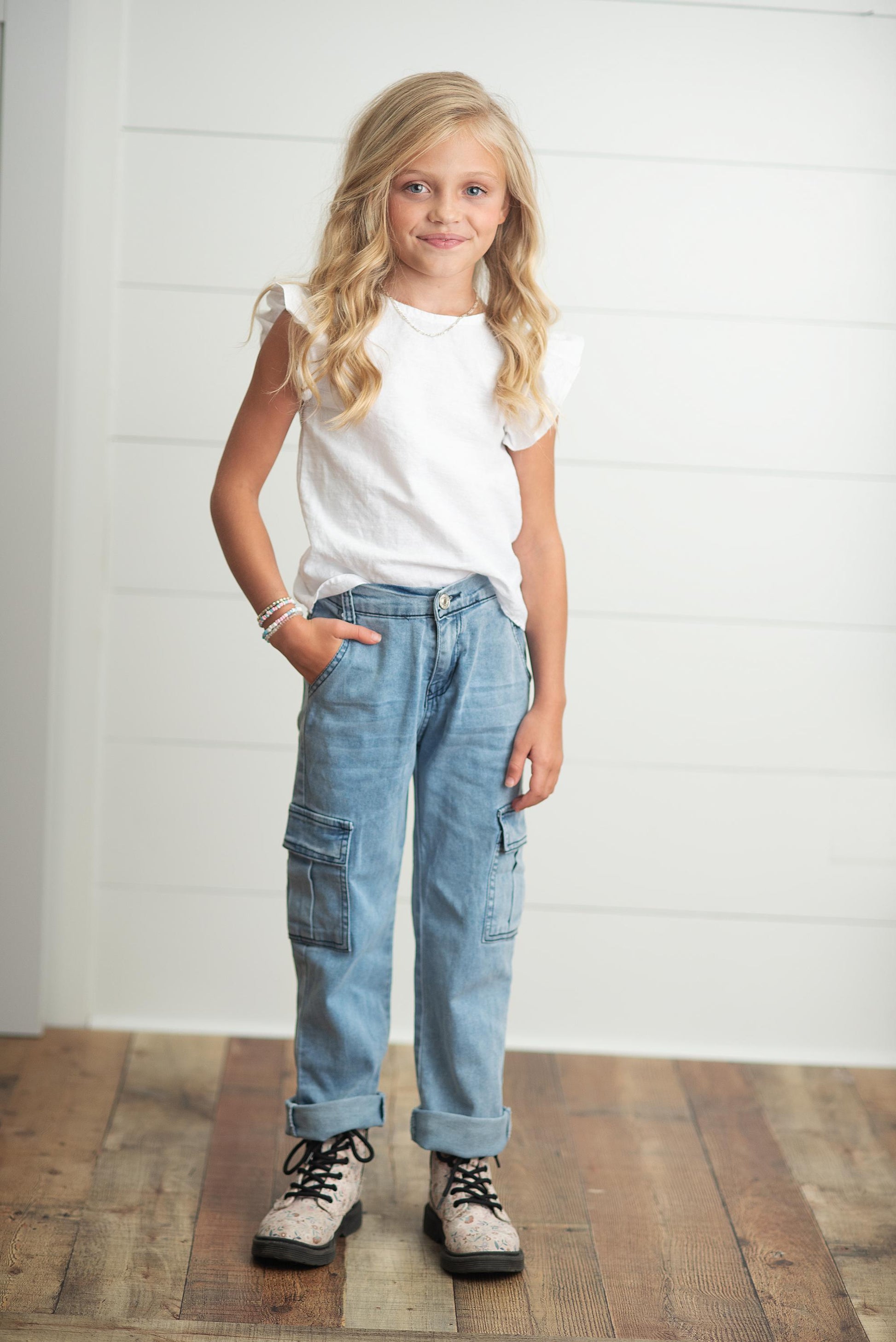 Adorable light wash denim cargo pants Jeans. Button and zipper front. Cutest basic all year long!