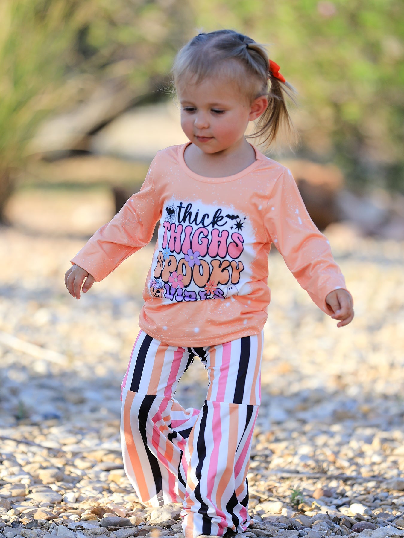 Celebrate Halloween in style with this eye-catching set featuring a bleached letter top paired with striped flared pants. The unique bleached design adds an edgy, festive touch, while the flared pants offer a flattering silhouette and comfortable fit. Perfect for making a bold statement at any Halloween event or casual outing, this outfit combines trendy details with all-day