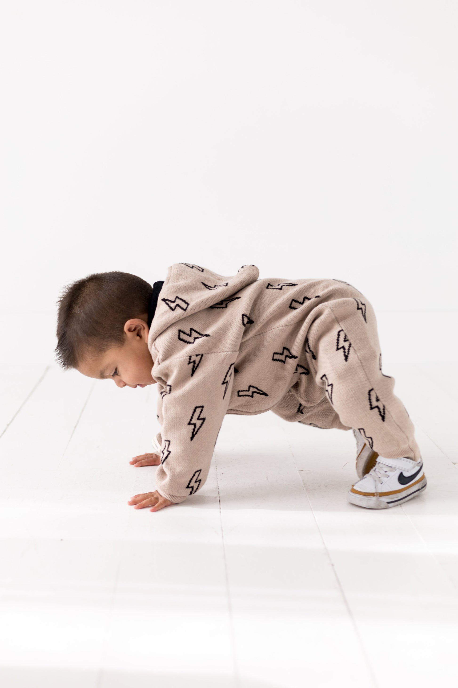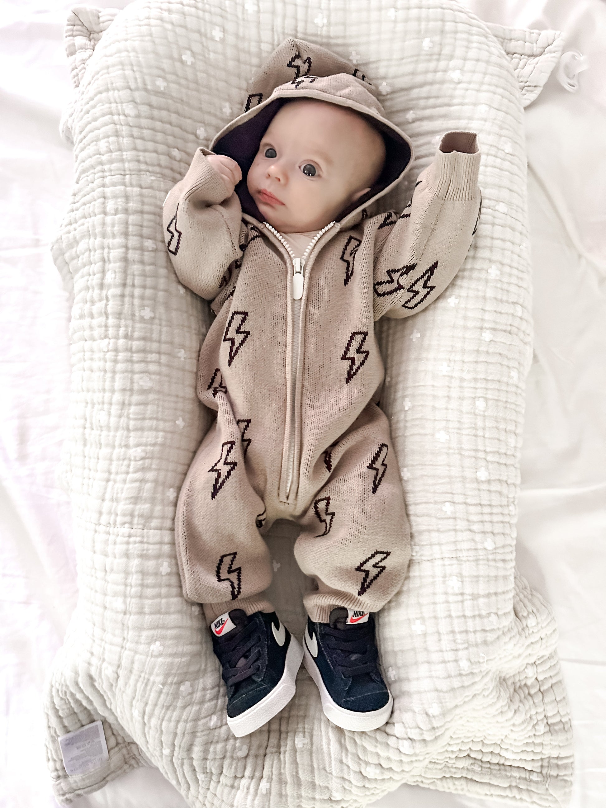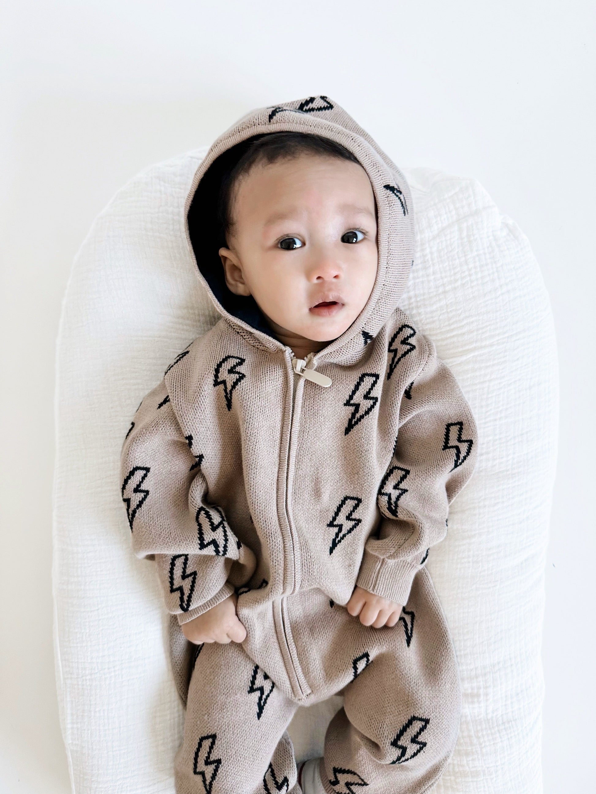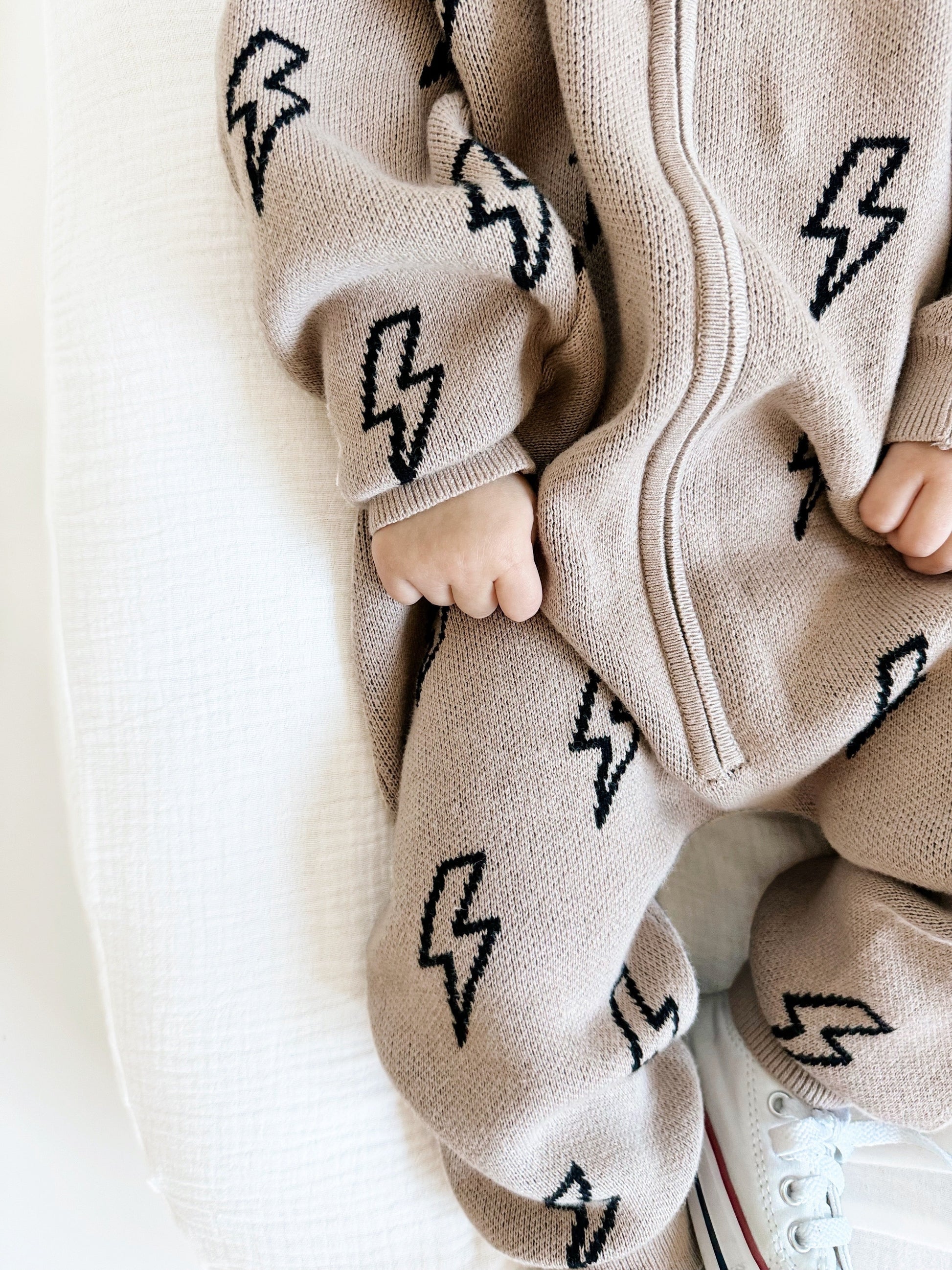 Your newest obsession is here! We created this perfect piece for the Mamas who love the rad vibes but also need that touch of class that only knits can bring. Our Rad Knitted Romper is made from 100% cozy, soft cotton. Medium beige background with black bolts for the ultimate neutral style. The attached hood is lined with a TRIPPLE layer of muslin cotton to keep ears cozy while adding the perfect touch of contrasting fabric. Custom made neutral beige zipper. External sleeve branding claims this one-of-kind romper.