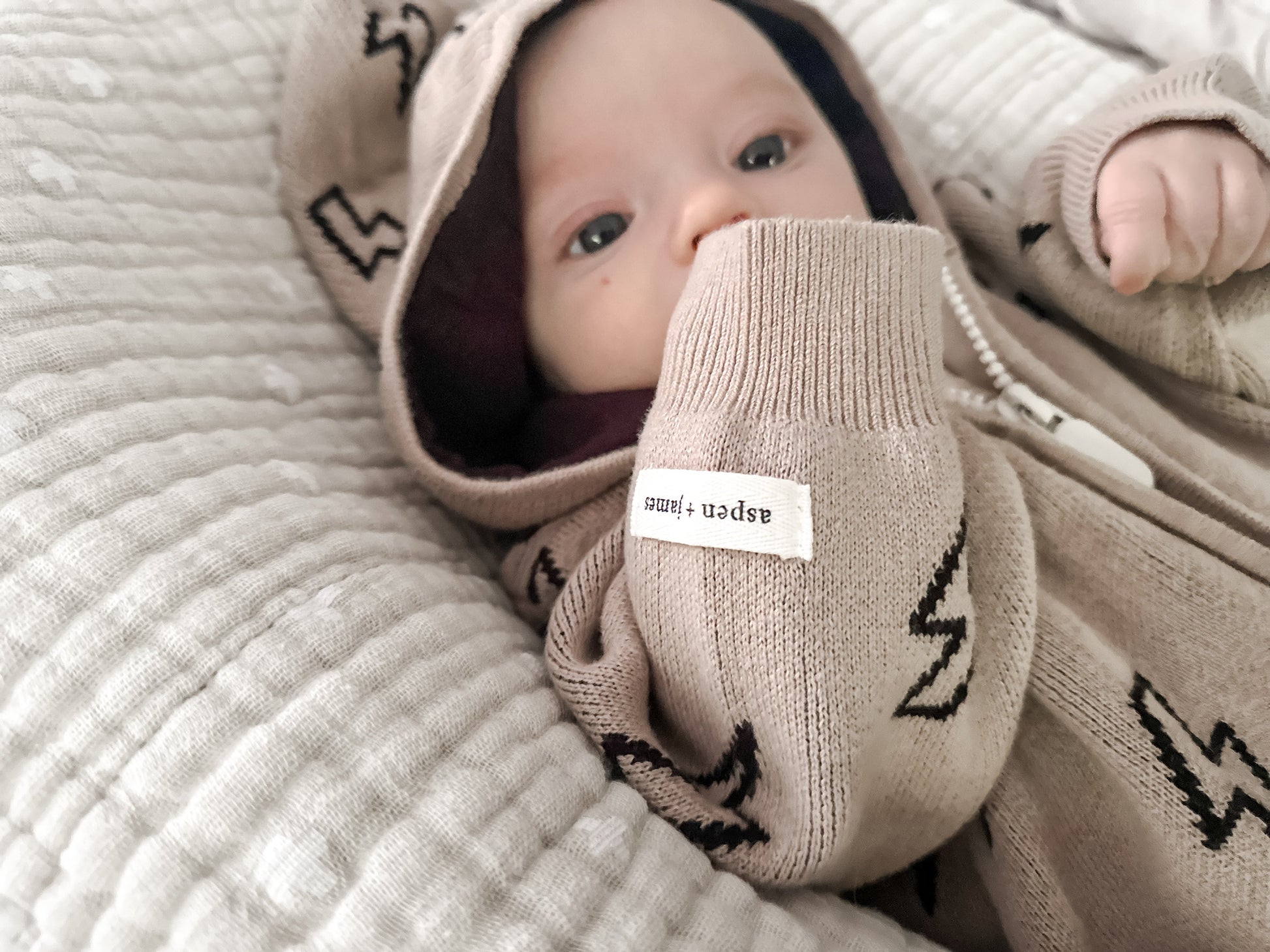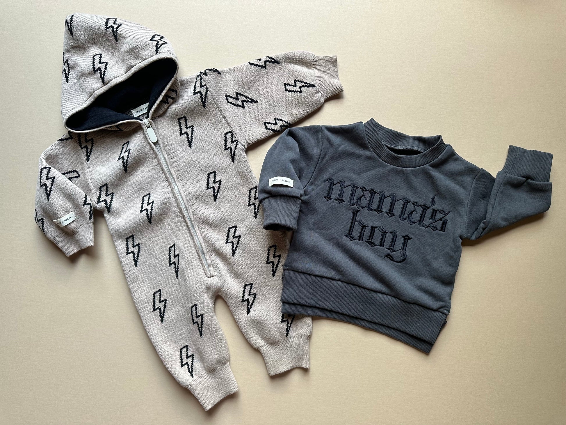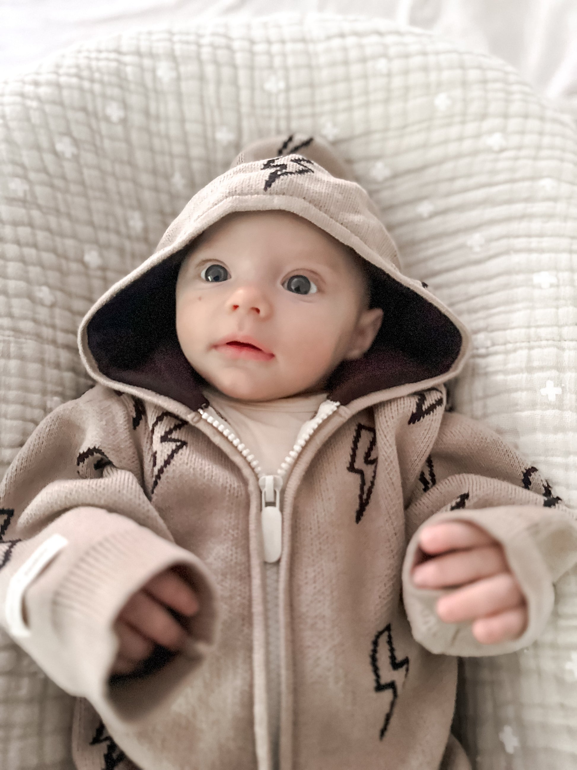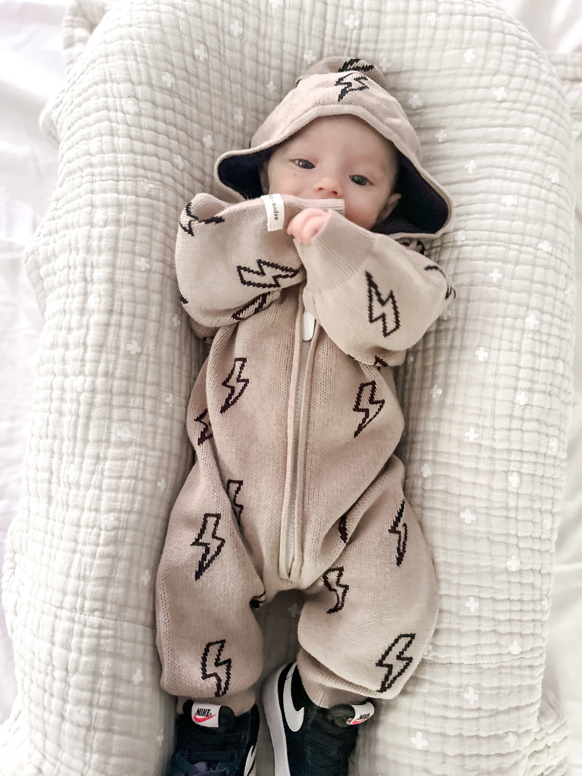 Your newest obsession is here! We created this perfect piece for the Mamas who love the rad vibes but also need that touch of class that only knits can bring. Our Rad Knitted Romper is made from 100% cozy, soft cotton. Medium beige background with black bolts for the ultimate neutral style. The attached hood is lined with a TRIPPLE layer of muslin cotton to keep ears cozy while adding the perfect touch of contrasting fabric. Custom made neutral beige zipper. External sleeve branding claims this one-of-kind romper.