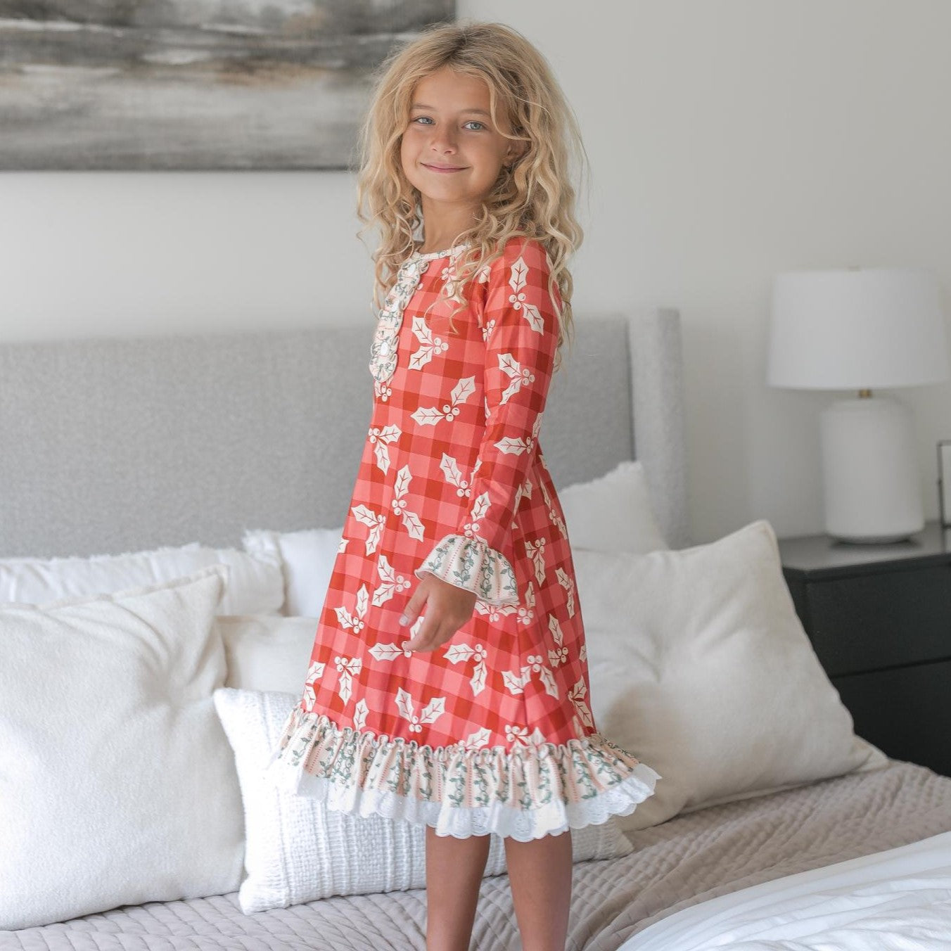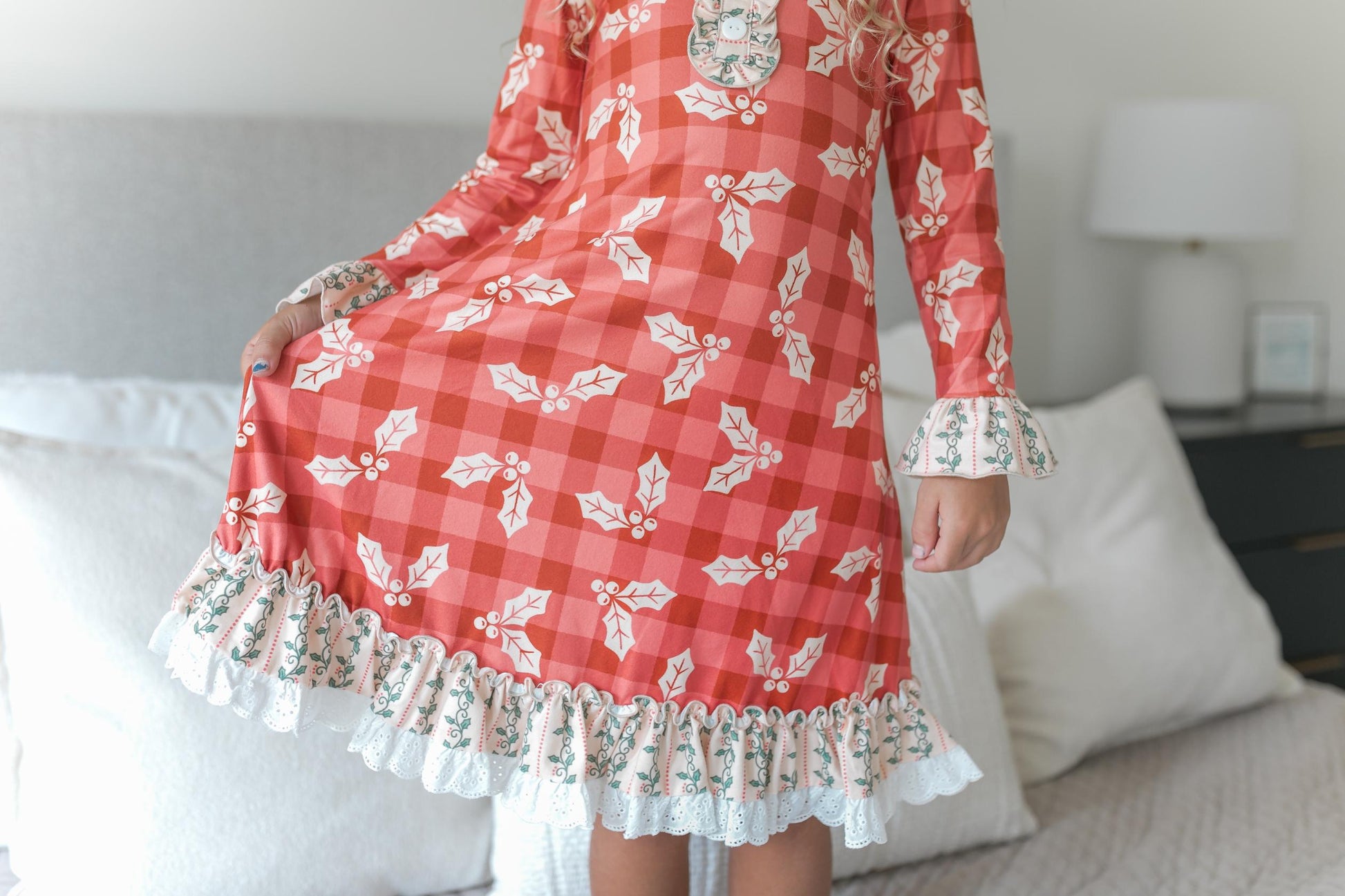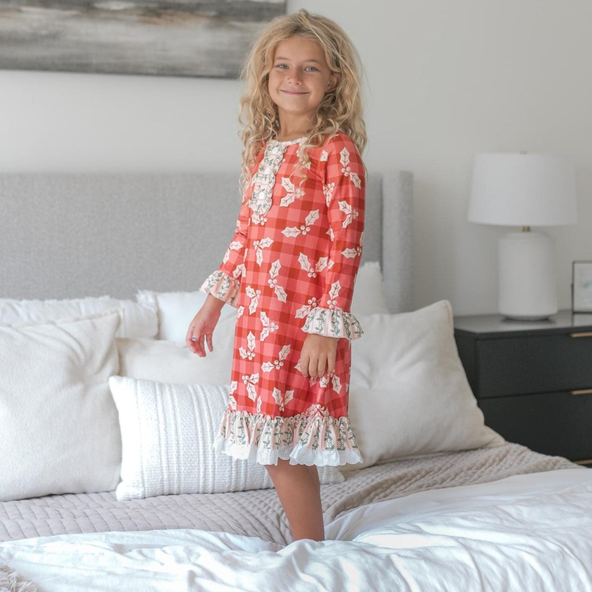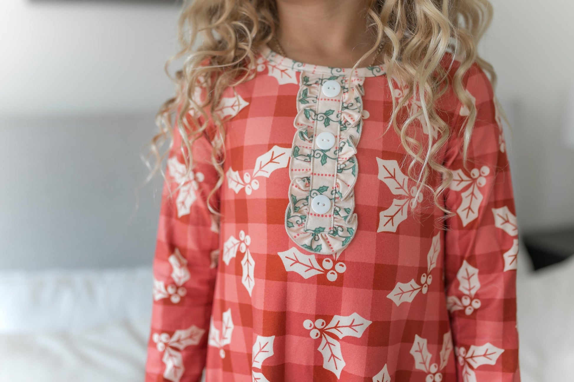 This girls' lounge gown features charming holly print and delicate ruffle trim, perfect for lounging around during the Christmas season. Made with soft and cozy material, it provides comfort for a restful night's sleep. Celebrate the holidays in style and comfort with our Red Holly Lounge Gown.