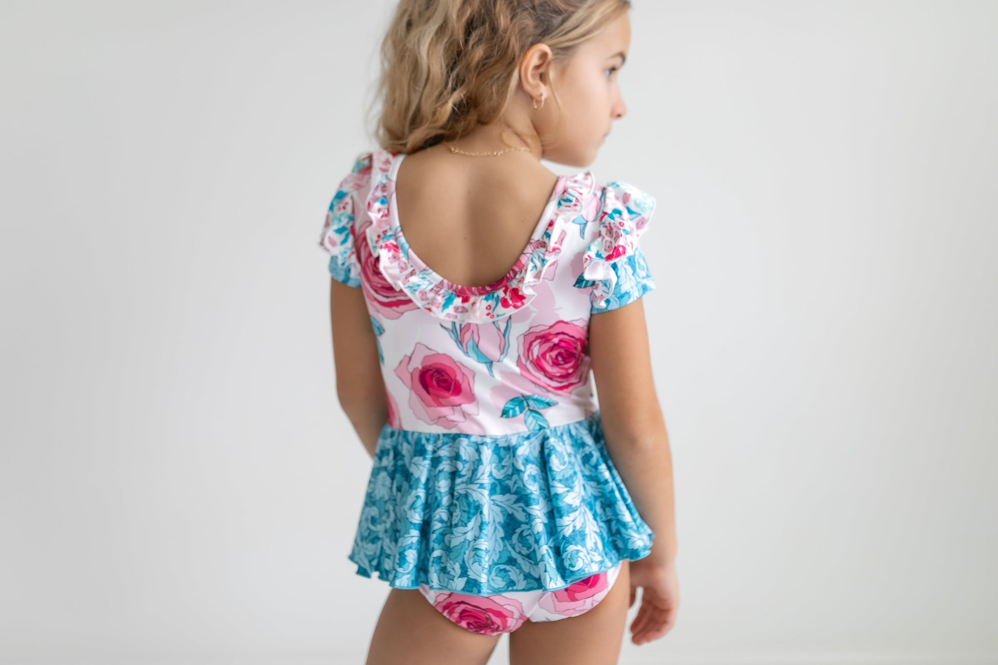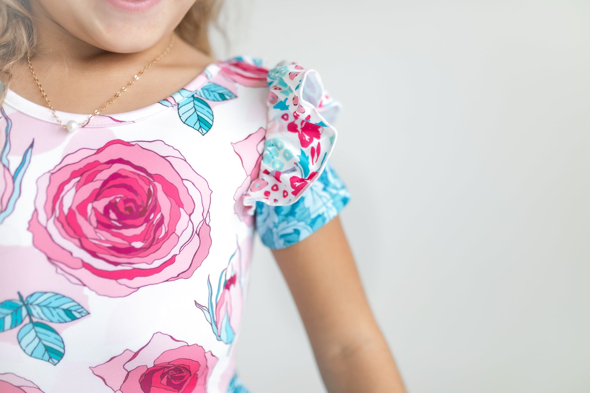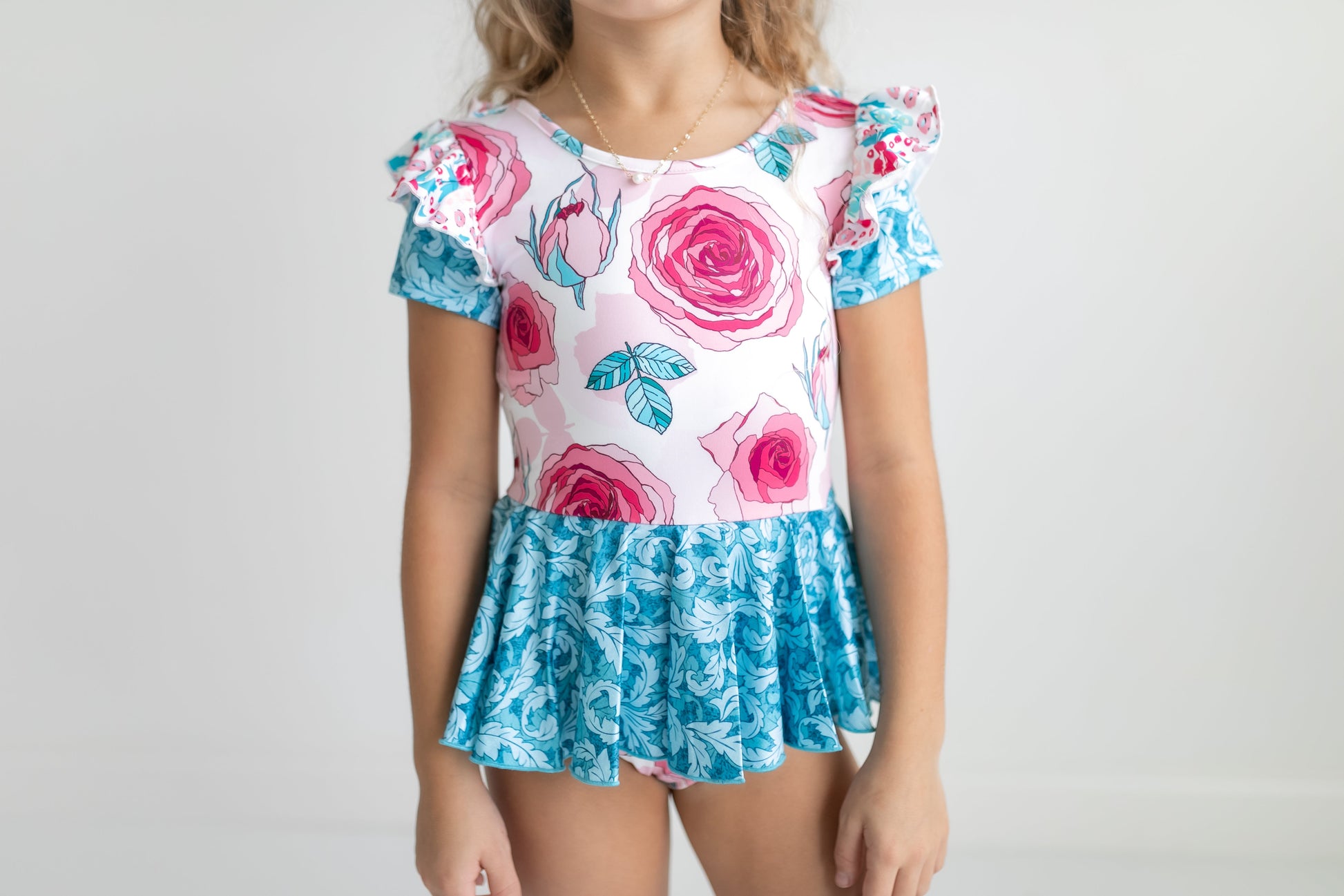 Leo Luvs Teal, Blue, and Pink Floral Print Short Sleeve Skirted Leotard. Cutest ruffle accents. Perfect for twirling at Dance, Tumble, Ballet, and Gymnastics!