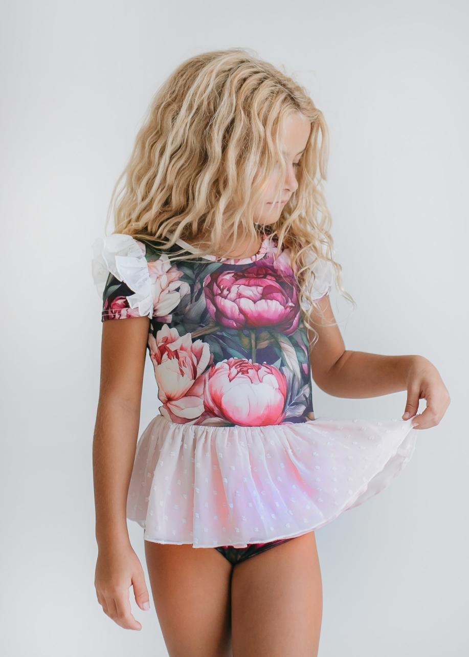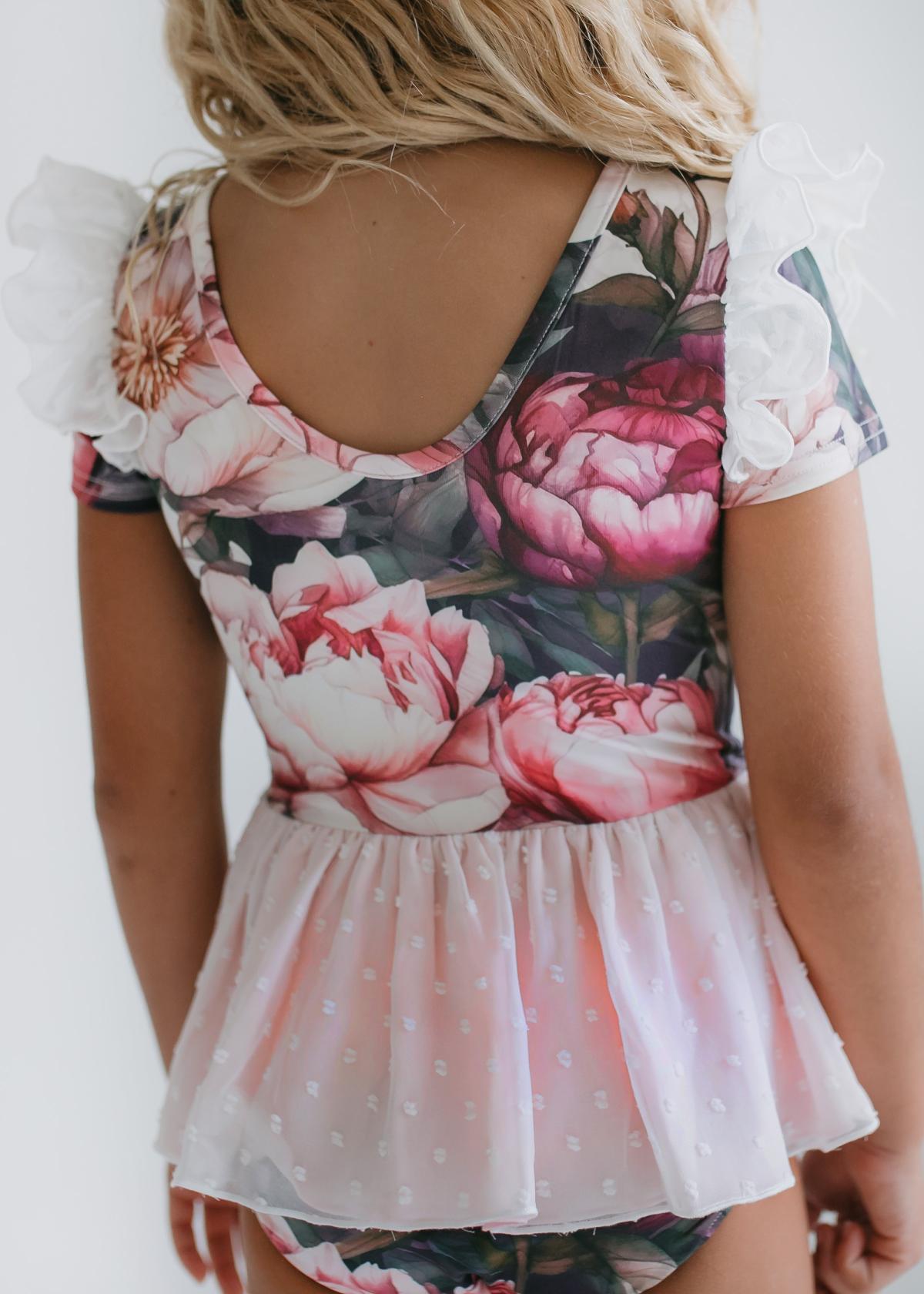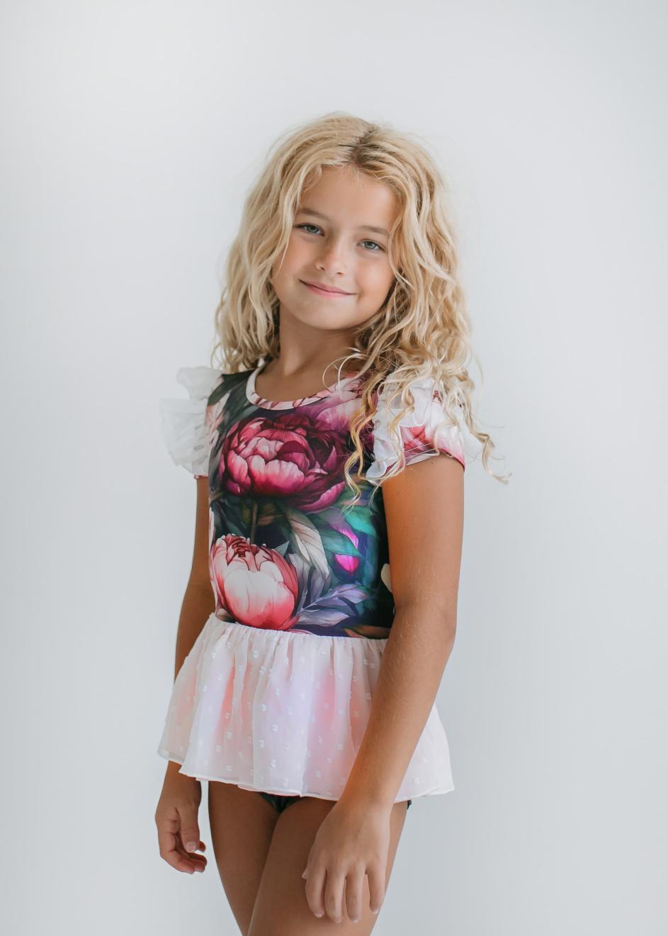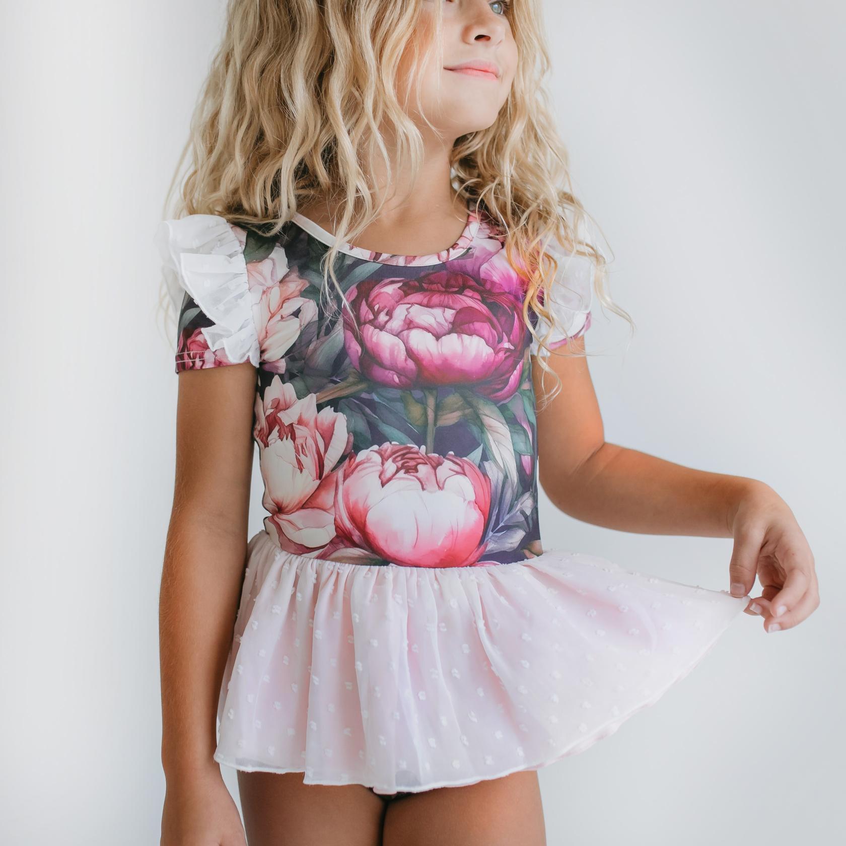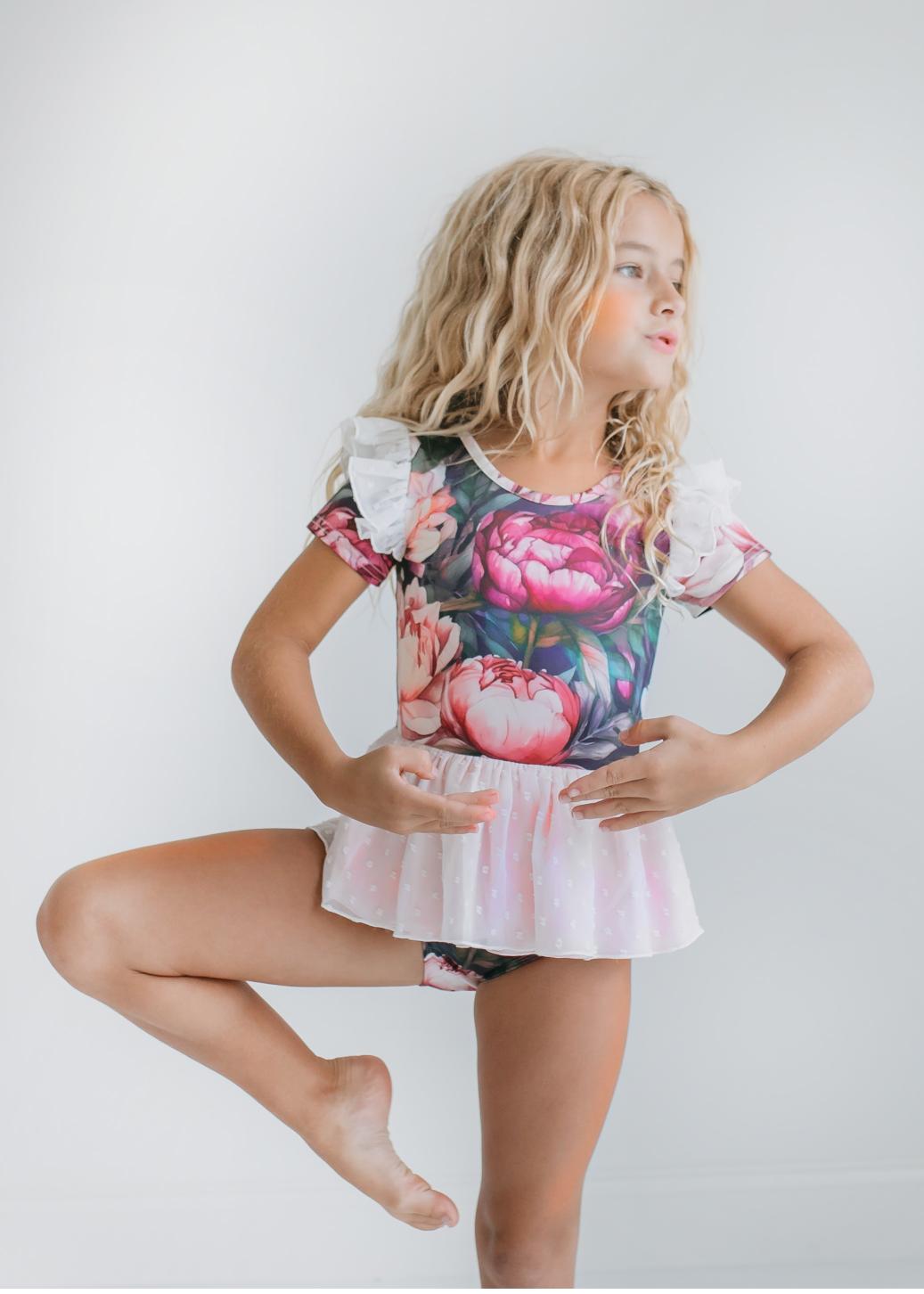 Leo Luvs Purple, Blue, and Pink Peonie Floral Print Short Sleeve Skirted Leotard. Cutest ruffle accents. Perfect for twirling at Dance, Tumble, Ballet, and Gymnastics!
